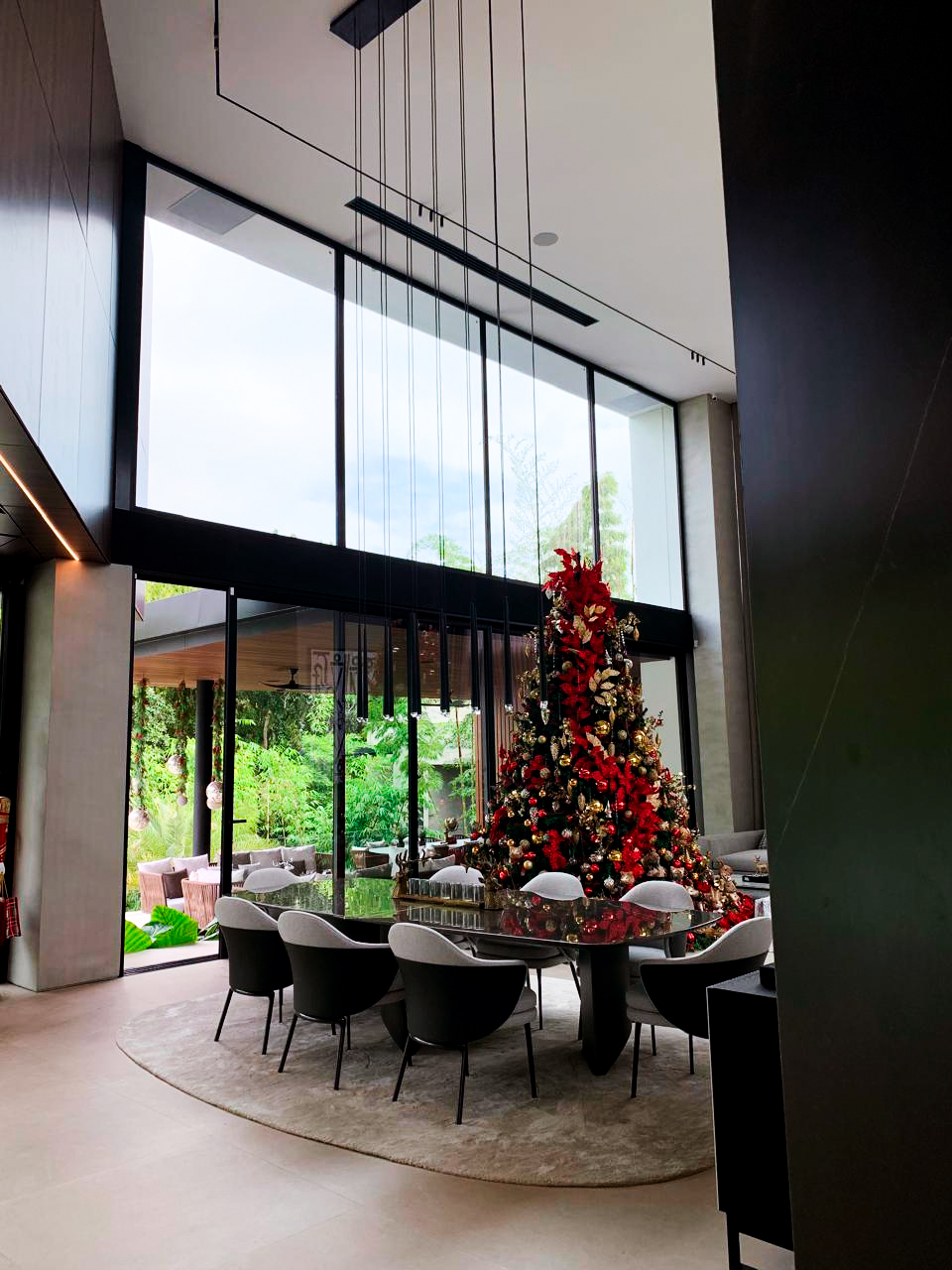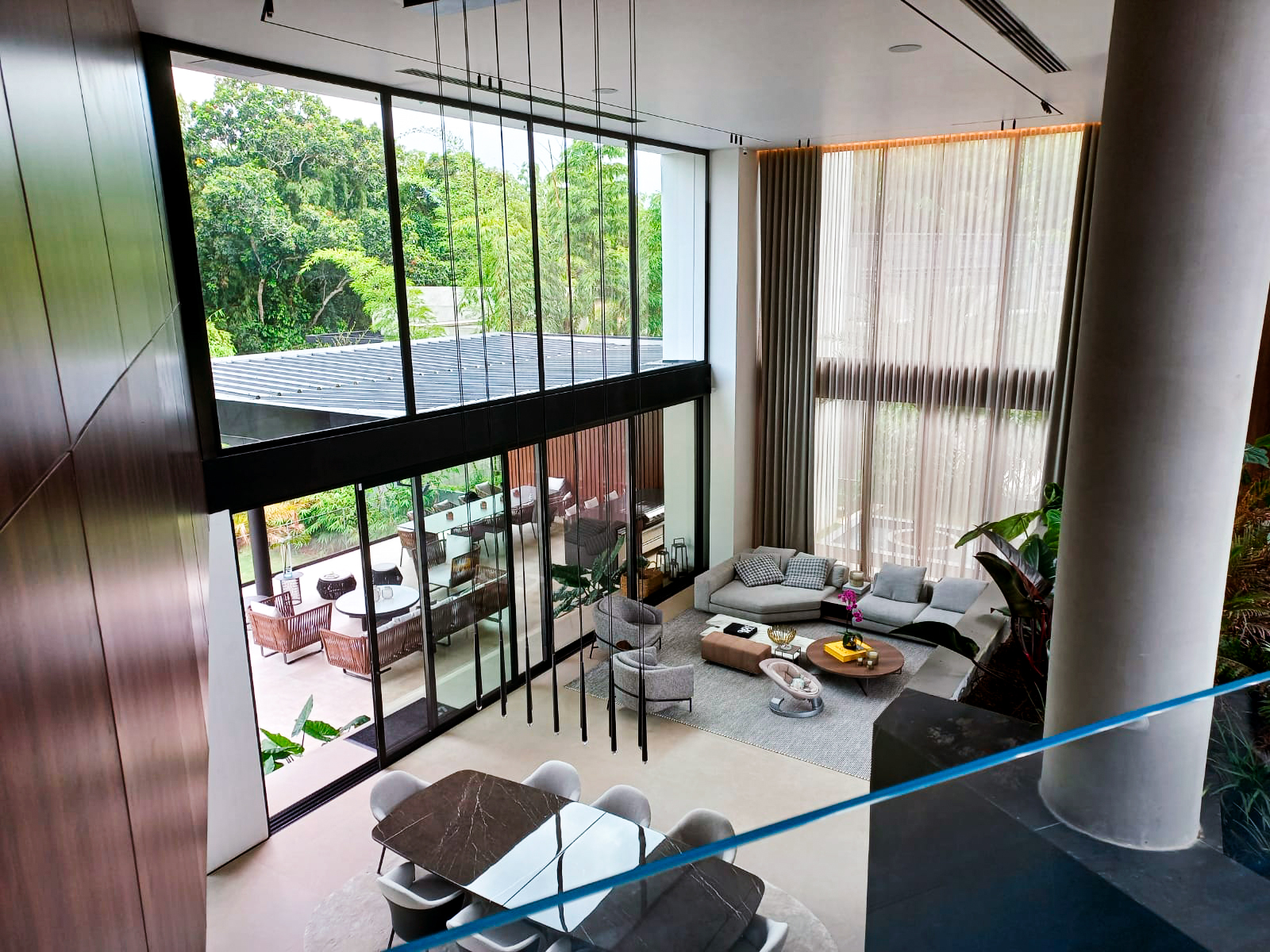 Instalación de ventanas tipo europeo en cristal laminado de control solar Low-E ultraclear N70/38; ventanas y puertas con vidrios antibala en áreas específicas; puerta principal