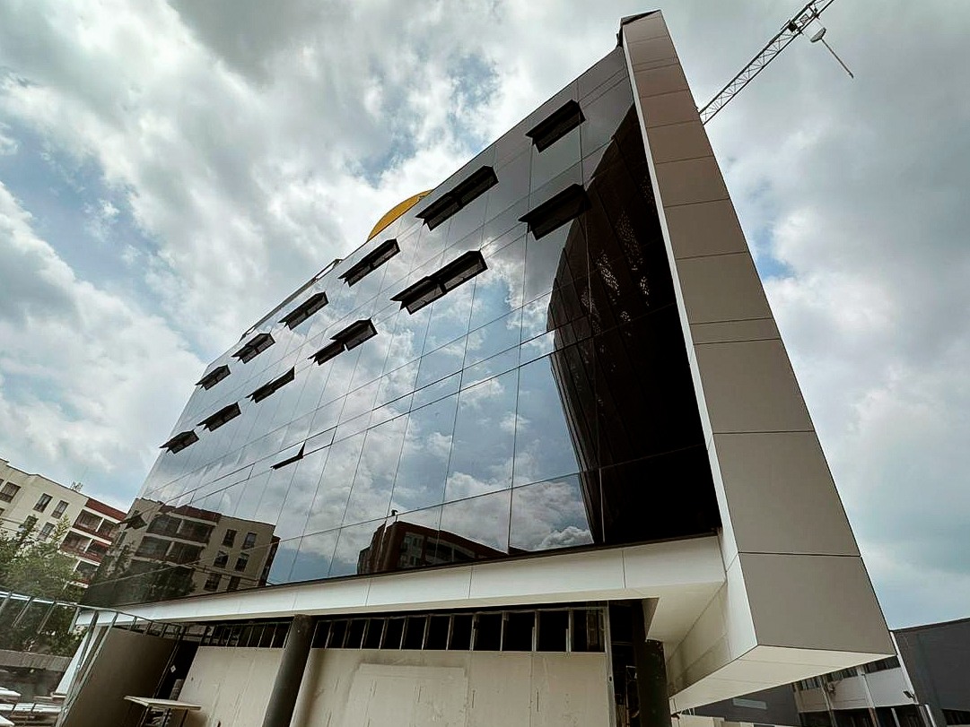 Fachada flotante Serie 45-688 tipo piel de vidrio, de apariencia continua y elegante, con ventilación proyectante y vidrio serigrafiado en cristal insulado laminado gris 6 mm HS + PVB Trosifol + cristal incoloro 5 mm + spacer 1/2” + cristal incoloro 6 mm HS, que garantiza aislamiento térmico y acústico.